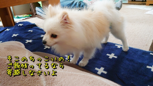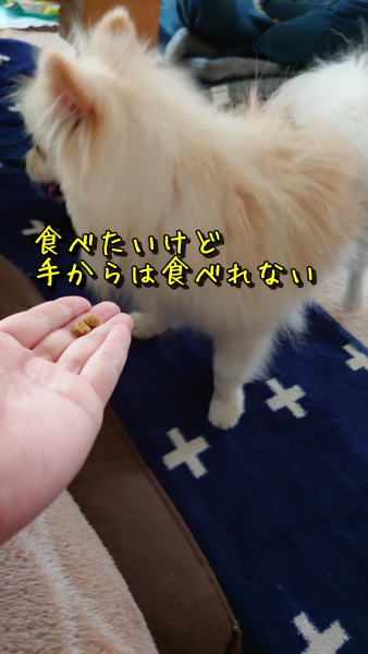 誰かほかの子が自分のお皿から私が取った物を美味しそうに食べてる姿を見たらスフレが食べるかもしれないと思って、スフレのお皿から3粒フードを拝借