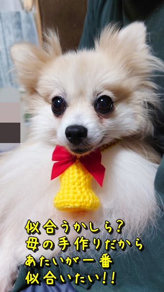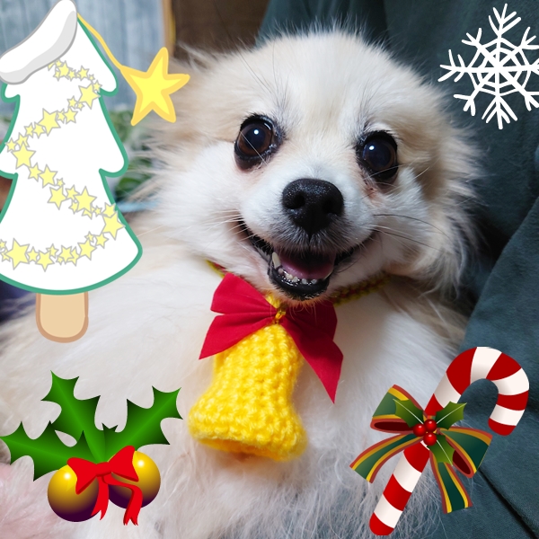 ぴょんが首からぶら下げているクリスマスベルは12/21に日本ライン花木センターで開催のDog’s Ohanaマルシェにて販売します✨