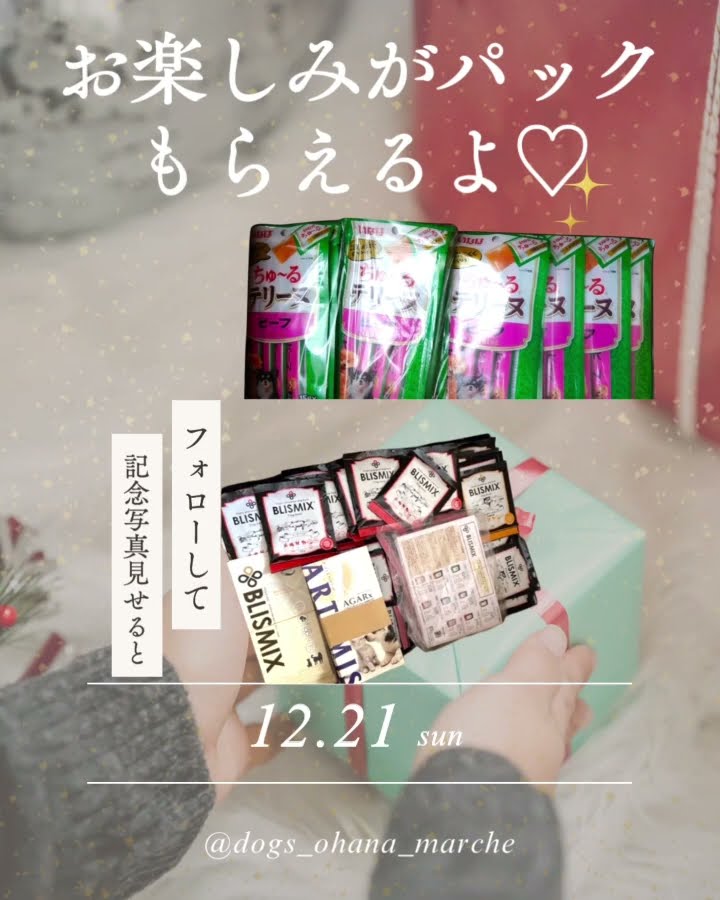 プレゼント企画としまして、Dog’s Ohanaマルシェの公式アカウントをフォローして頂いていて、花木センターの正面入り口横に設置されているクリスマスのフォトスポットと、Dog’s Ohanaマルシェ会場内に設置するフォトスポットで写真を撮って受付で見せて頂くだけです❕