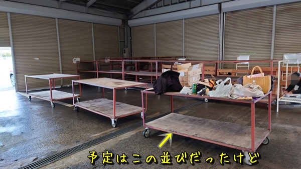 前日のバミリはね、THE倉庫ってトコろから、台を各ブースに配置しただけで