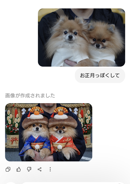 で、クリスマスが終わってだから、きのこ犬から数日置いて「お正月バージョンの画像加工もできるのかな❓」🤔って思って、再度やってみたの❕